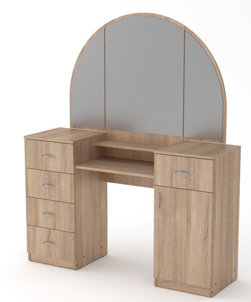 Корпус і фасади виготовлені з ДСП. Розмістити у ящиках трюмо інструменти для укладання волосся, косметику і парфумерію — це практичне і розумне рішення, яке допоможе вам заощадити час на збори вранці і додасть елементи комфорту в звичайному житті.