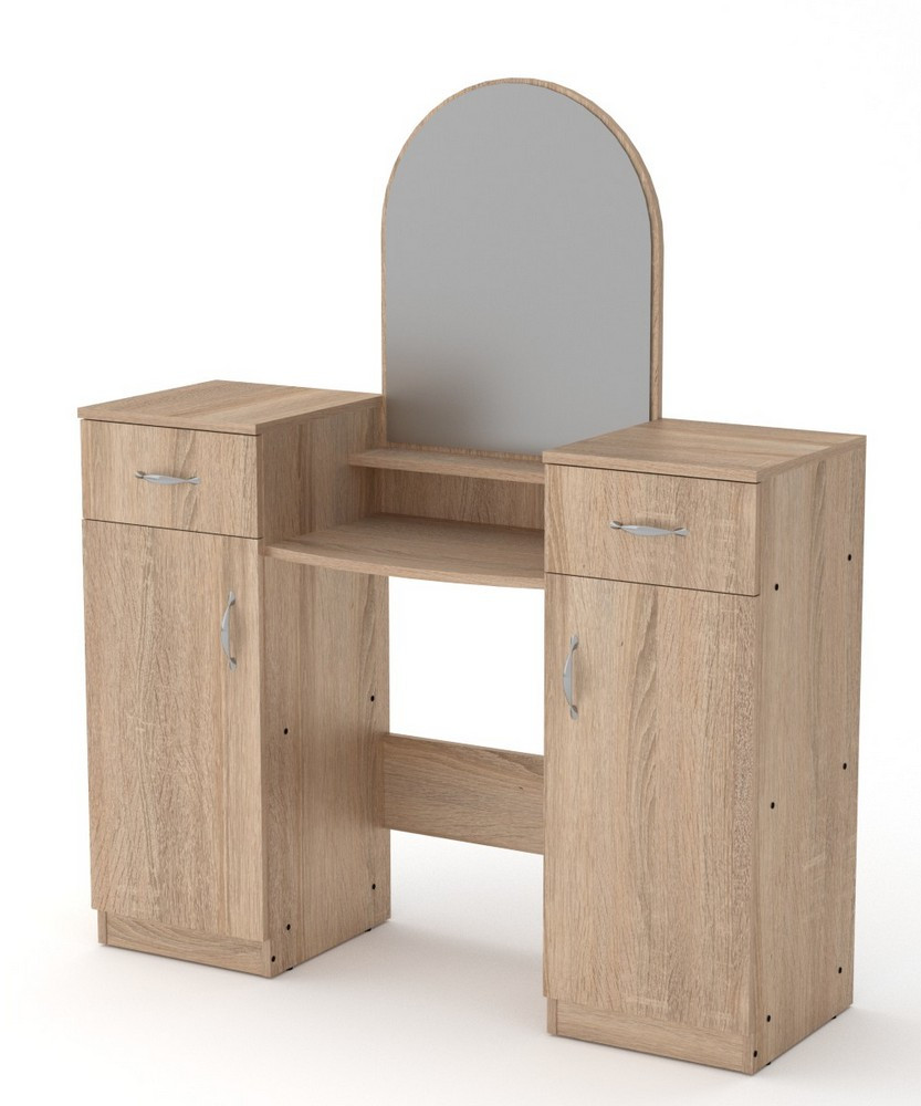 Корпус і фасади виготовлені з ДСП. Розмістити у ящиках трюмо інструменти для укладання волосся, косметику і парфумерію — це практичне і розумне рішення, яке допоможе вам заощадити час на збори вранці і додасть елементи комфорту в звичайному житті.