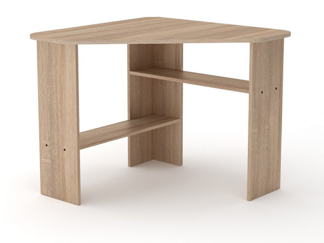 Письмовий стіл Учень-2 виготовлений з ламінованого ДСП, товщиною 16 мм, крайка ПВХ 0,5 мм Кутовий стіл з полками під стільницею має просту і надійну конструкцію. Полиці здатні розвантажити робочу поверхню і зроблять її менш захаращеною.