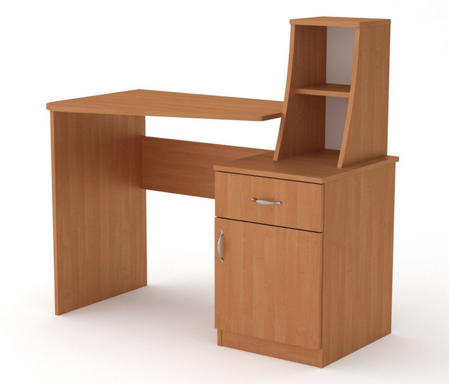 Письмовий стіл Школяр-3 виготовлений з ламінованого ДСП, товщиною 16 мм, крайка ПВХ 0,5 мм Стіл має цікавий дизайн і є комфортною та функціональною моделлю, яка підійде для облаштування кімнати як школяра, так і студента. Вбудований ящик розмістить необхідні письмові приналежності, а полиці над стільницею розмістять предмети, які повинні бути під рукою.